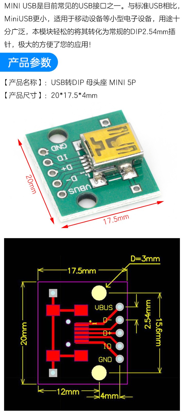 规格型号:MINI-5P模块汽车电子转接板